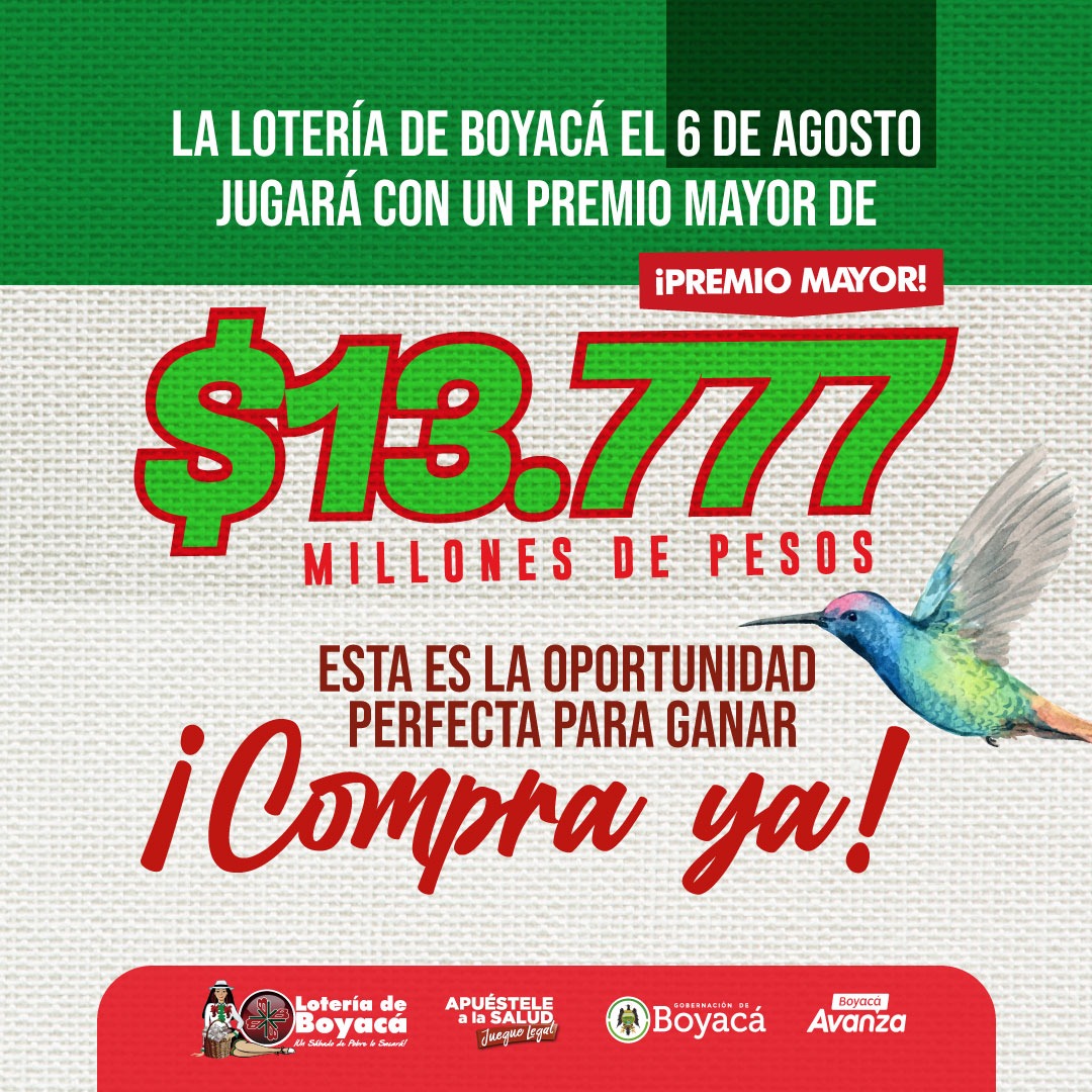 La lotería de boyacá juega todos los sábado a las 10 y 30 de la noche, entrega un premio mayor de 6.000 millones de pesos, esta es una de las loterías que más entrega en su premio mayor. La forma de jugar la lotería de boyacá es seleccionando cuatro números de un. Encuentra aquí los ultimos resultados de la lotería de boyacá. No te quedes sin ganar, compra el billete o fracción y participa por espectaculares premios. Sábado 19 de junio de 2021.